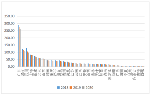 从产出指数来看,2020年产出指数较高的前五个省市为广东、北京、四川、浙江、上海,排名相较于2018、2019年有所变动,四川晋升前列,江苏掉队,其中广东、北京、浙江近三年产出指数稳居第一梯队且保持全国前三。